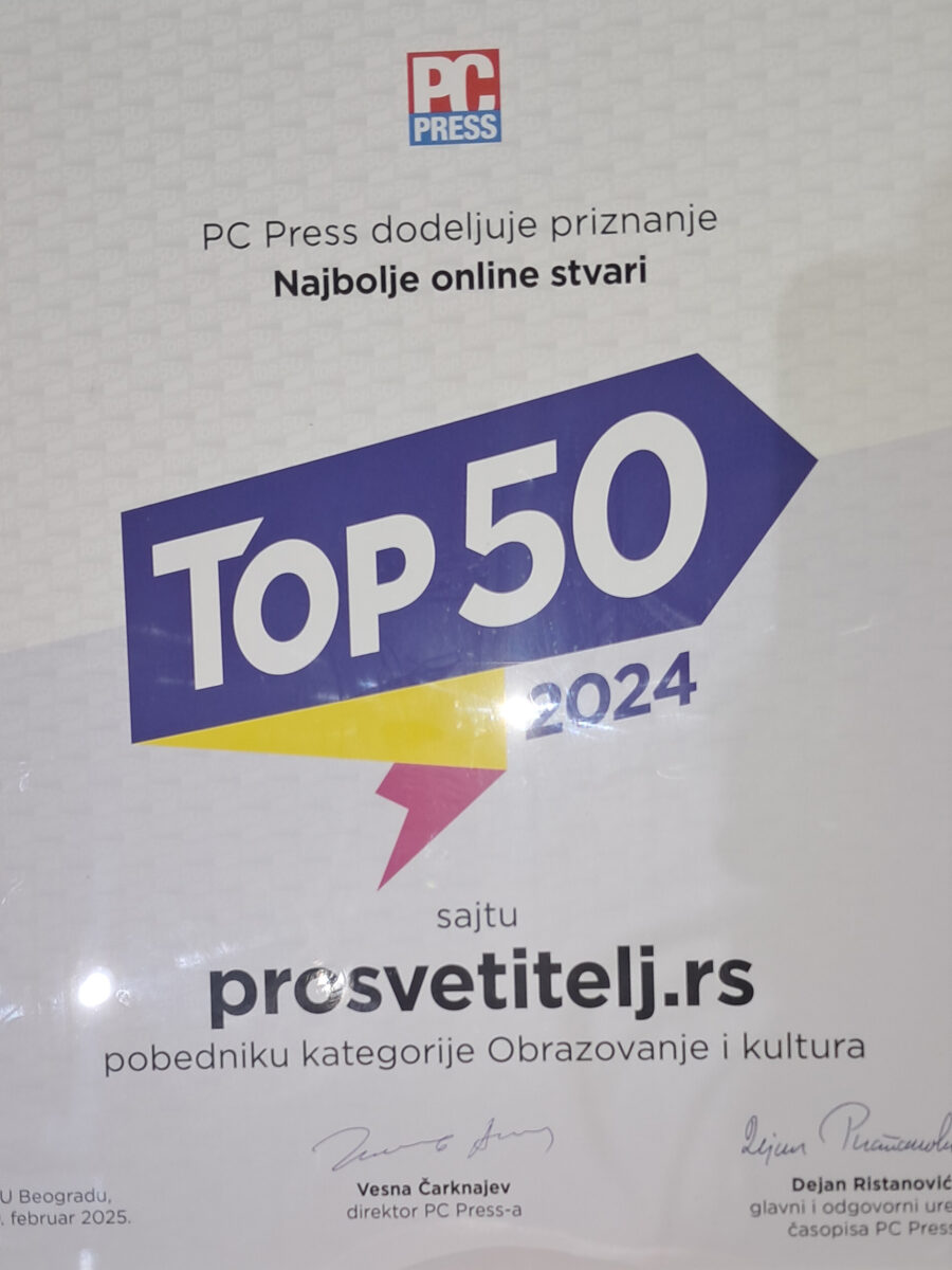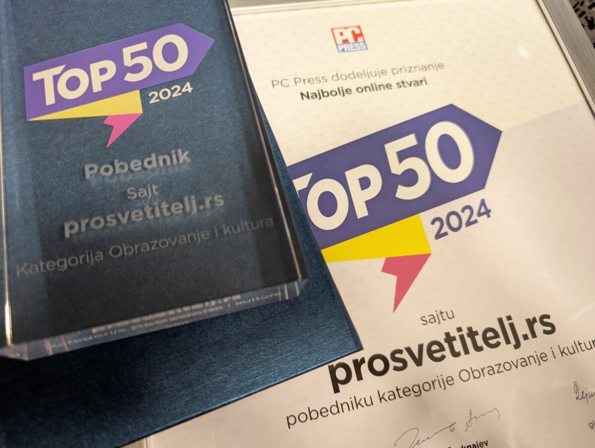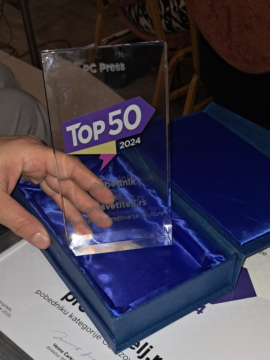 Сајт prosvetitelj.rs добио је престижно признање у оквиру награде PC Press ,,TOП 50 онлајн ствари”, која се сваке године додељује најбољим сајтовима, апликацијама и ауторима на друштвеним мрежама!