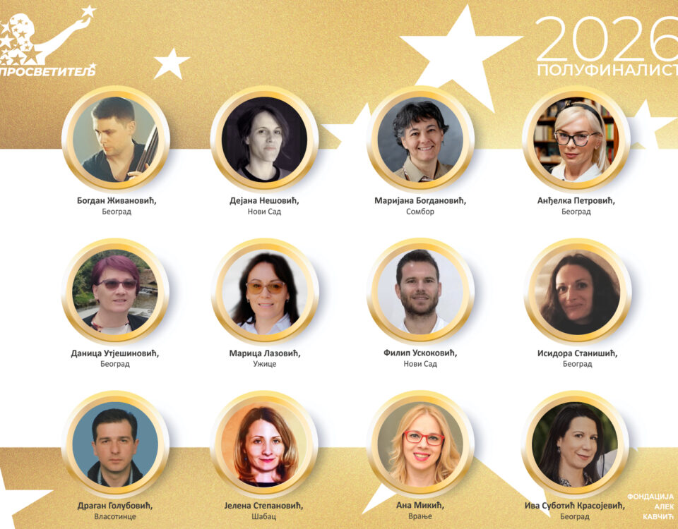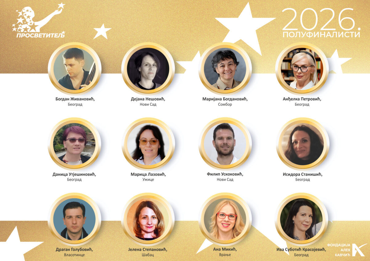 Организатор, Фондација Алек Кавчић, обавештава јавност да је у оквиру конкурса Просветитељ, у периоду до 15. априла, једанаест чланова жирија изабрало дванаест полуфиналиста из пристиглих пријава.
