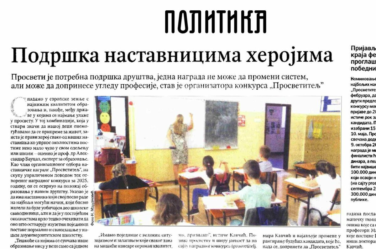 Професор Александар Бауцал, проф. Алек Кавчић и добитник признања ,,Просветитељ'' за 2024. годину, наставник Младен Шљивовић, говорили су за ,,Политику'' о награди ,,Просветитељ''.